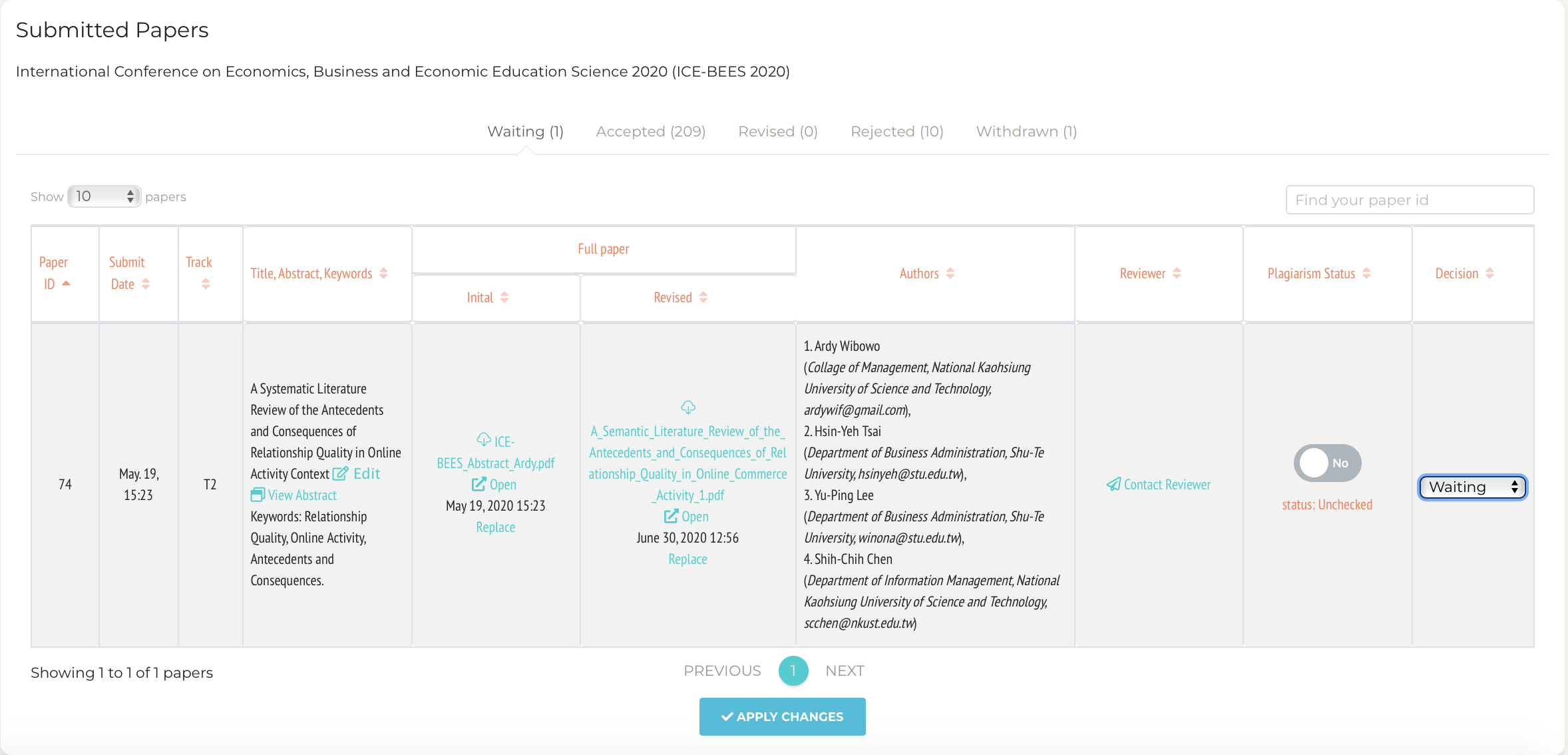 We re-styled management system as easy as you wish. Submission page with decision, chat feature with your authors or reviewers, email notification each decision, and quick conference management installment.